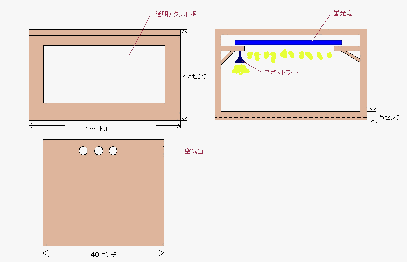 | がくぞうさんが蛍光灯、スポットライトを取り付け、 床に遠赤外線ヒーターを敷きました。 中央の奥壁と左壁に付いている温度計が サーモスタットです。 | |