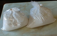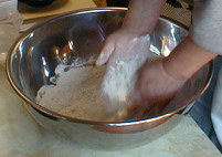 ![]() これが一番最初の一番大事な作業 そば粉を取り出し練り撥にあけます。 このときに、粉に状態を確認し水の量を決めます。 |