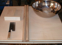 ![]() とりあえず必要な道具 延し板、麺棒、麺包丁、駒板 |
