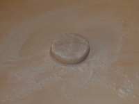 ![]() 生地の状態により一度練り直します。 板に別に用意した打ち粉を振り、ある程度まで手で広げます。 ある程度ってどの程度?(笑 |
