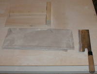 ![]() いよいよ切ります ここで気をつけるのは駒板の動きです。 手は板に添えるだけで、包丁の刃で押しながら切って行きます |