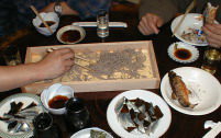 そばをおいしく食べるにはいい肴といいお酒が欠かせません。この日の肴は取れたての鯖を使ったしめ鯖と、炭火で焼いた落ち鮎の塩焼き。お釜で炊いた鮎ご飯でした。 |